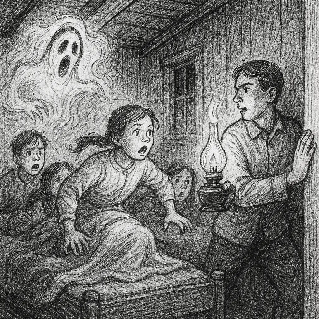 Da han så de vettskremte barna i sengene, ba han dem forklare. Etter å ha hørt historien, gikk han bort til veggen hvor lydene hadde kommet fra. Han la hånden mot treverket, trakk pusten dypt og spurte høyt: